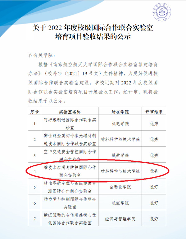 2024年3月15日,校国际合作处公布了2022年校级国际合作联合实验室培育项目验收结果。经过专家评审评议,IINT课题组牵头负责的“核技术应用与防护国际合作联合实验室”项目获评优秀,顺利通过验收。