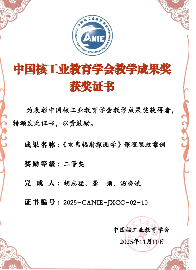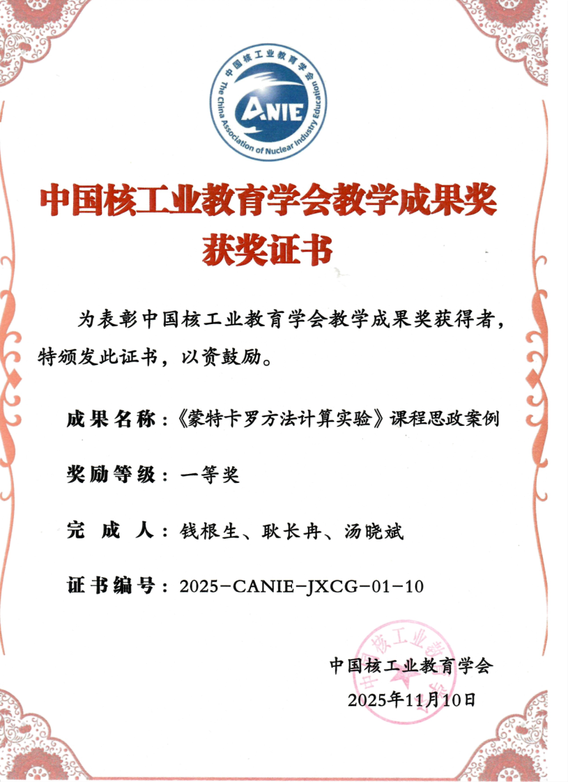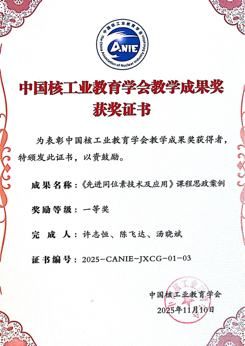 2025年6月28日,中国核工业教育学会公布了第二届涉核课程思政案例优秀教学成果评议结果。本届涉核课程思政案例共征集到 30个单位 143 份案例成果,评议产生了一等奖15项,二等奖29项,三等奖43项。IINT课题组获得优秀课程案例一等奖2项(许志恒、陈飞达、汤晓斌申报的《先进同位素技术及应用》课程思政案例;钱根生、耿长冉、汤晓斌申报的《蒙特卡罗方法计算实验》课程思政案例),二等奖1项(胡志猛、龚频、汤晓斌申报的《电离辐射探测学》课程思政案例)。