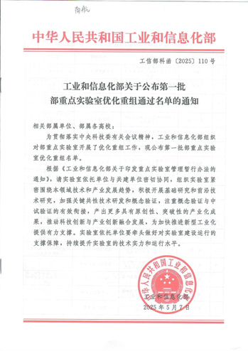 2025年5月7日,工业和信息化部公布了第一批部重点实验室优化重组通过名单。为贯彻落实中央科技委有关会议精神,工业和信息化部从2024年9月起组织对部重点实验室开展优化重组工作。第一批优化重组通过的工信部重点实验室共计47家;其中,材料领域3家,高端制造领域4家,车辆领域1家,医疗装备领域1家,航空航天领域11家,海洋技术与工程领域2家,核技术与安全领域1家,医药领域3家,电力电子领域1家,电子和通信领域3家,信息技术领域8家,无线电领域3家,空天信息领域1家,电磁兼容领域1家,人工智能领域2家,量子科技领域1家,绿色低碳领域1家。南京航空航天大学共获批5家。