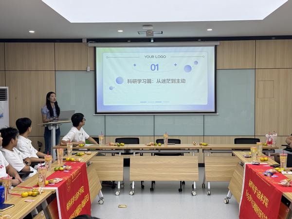 随后,赵江从科研心态切入,分享了自己在科研生活中的感悟。他指出,科研过程难免会遇到挫折,学会调整心态、善于自我调节至关重要。他鼓励大家通过跑步、骑行、打球等运动来缓解压力,以积极心态面对科研与生活。在交流互动环节中,新生们也纷纷分享了各自的兴趣与解压方式,如排球、健身、爬山等,现场氛围轻松热烈。赵江勉励大家在热爱生活的同时,也要学会热爱科研,把科研视作一段值得珍惜的旅程。