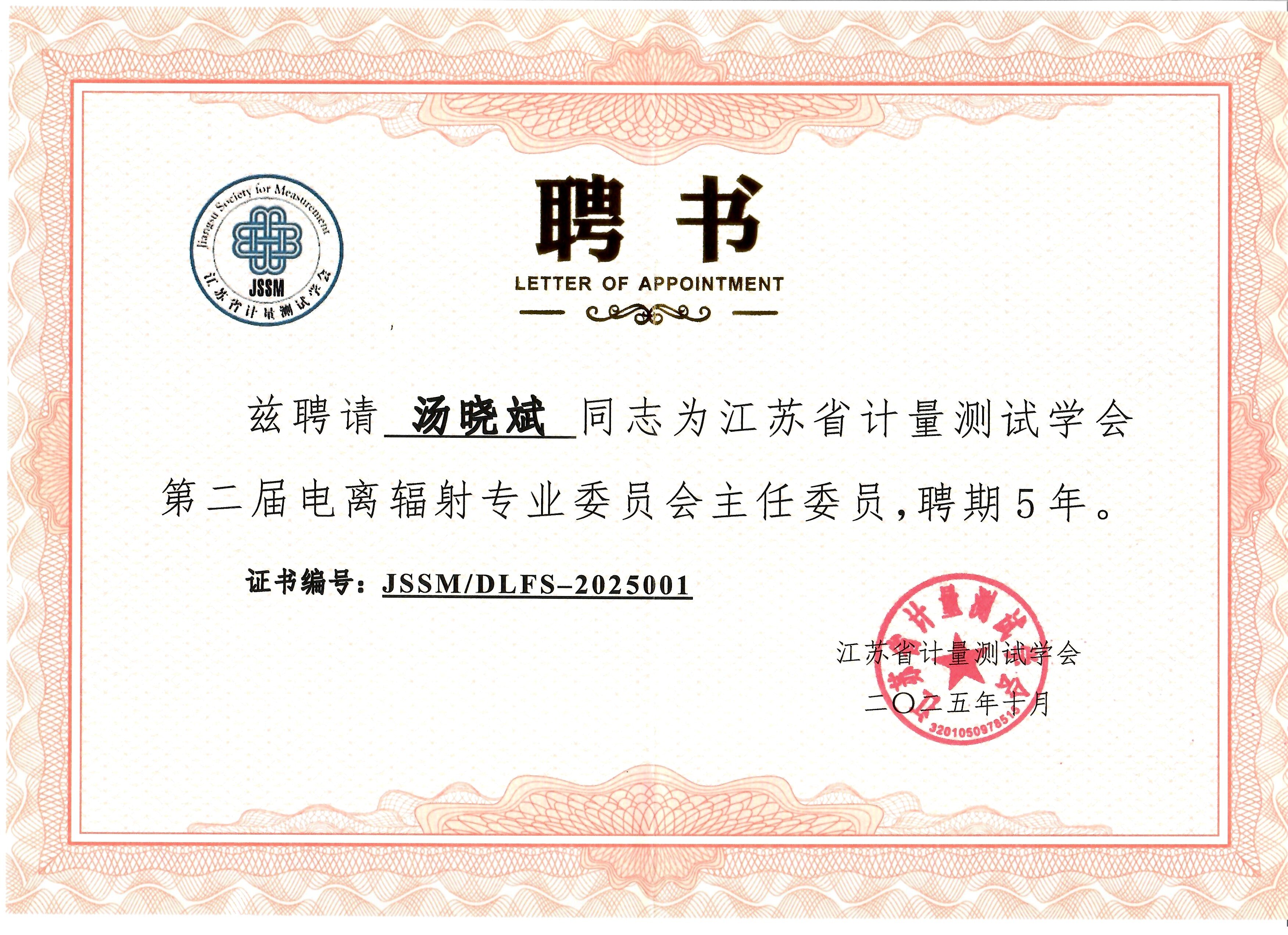 2025年10月10-11日,江苏省计量测试学会电离辐射专业委员会换届会议暨2025年学术论坛在南京顺利召开。IINT课题组汤晓斌教授继续受聘第二届江苏省计量测试学会电离辐射专业委员会,许志恒、胡志猛副教授当选专委会委员。