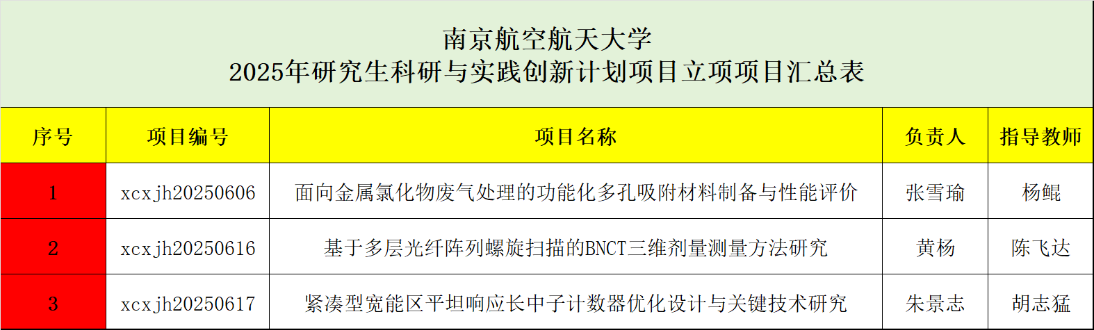 IINT课题组今年共3位硕士研究生获批立项,分别是:张雪瑜《面向金属氯化物废气处理的功能化多孔吸附材料制备与性能评价》,黄杨《基于多层光纤阵列螺旋扫描的BNCT三维剂量测量方法研究》,朱景志《紧凑型宽能区平坦响应长中子计数器优化设计与关键技术研究》。