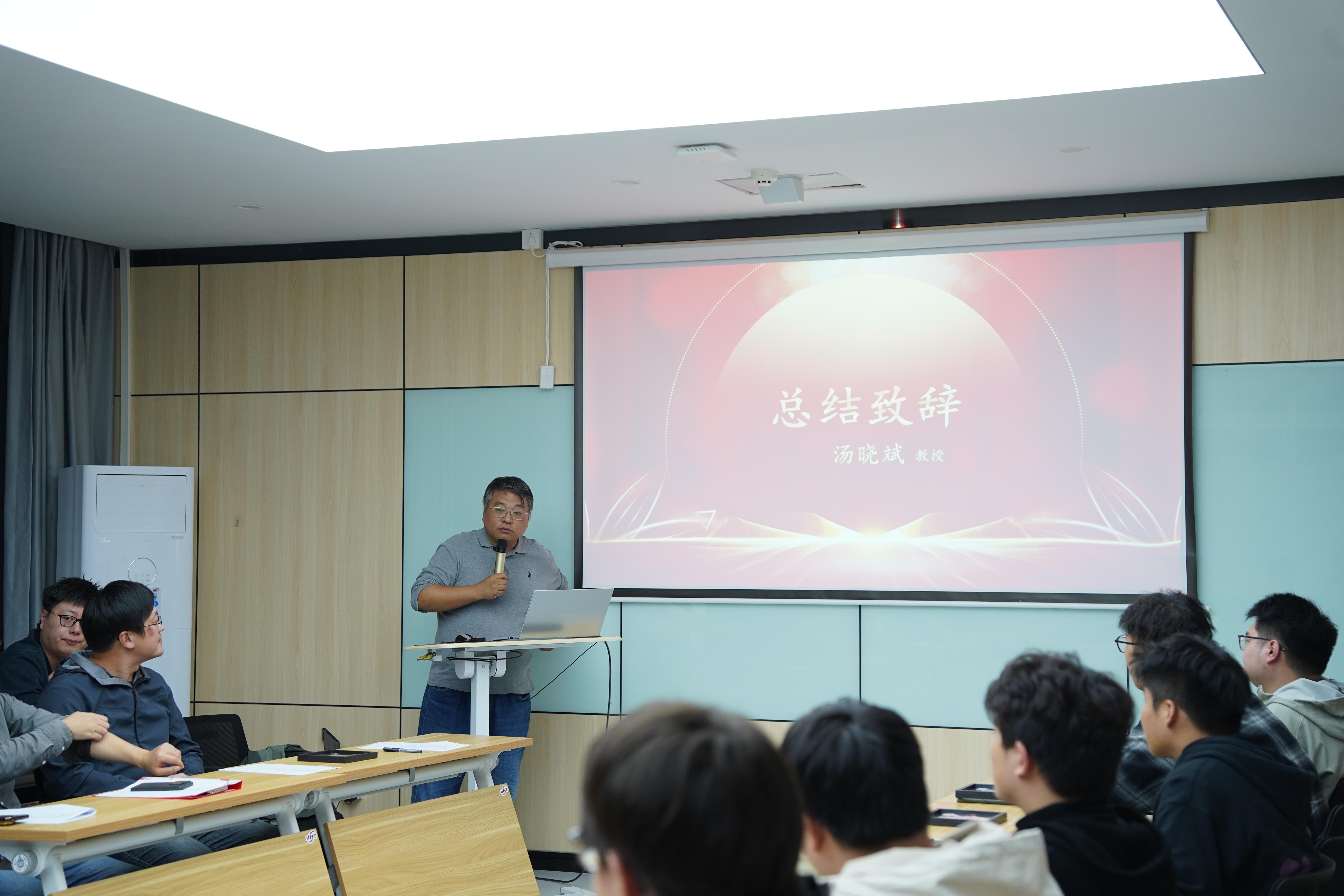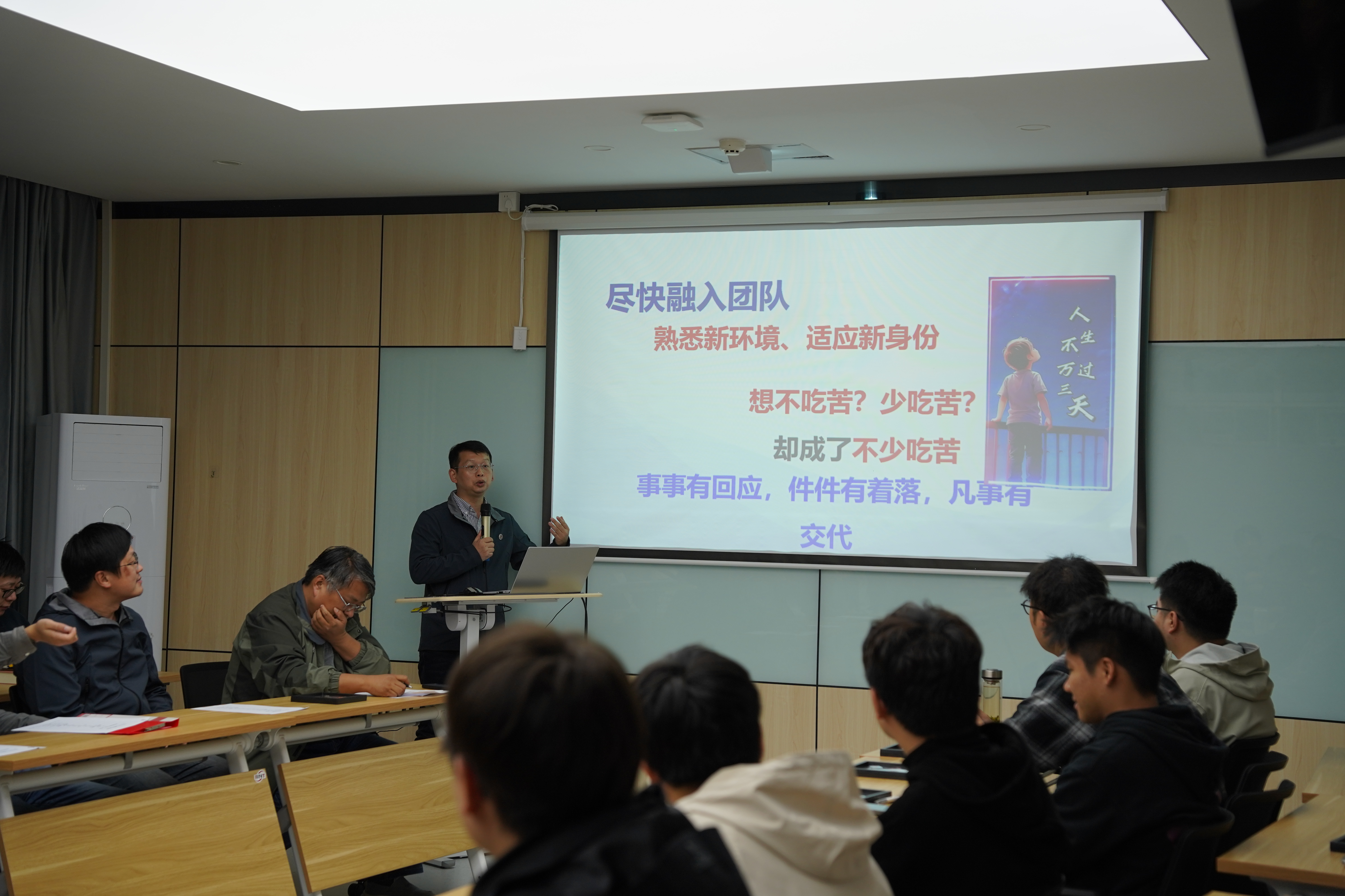 第四部分为:总结凝心,规划未来。在迎新典礼的尾声,课题组负责人汤晓斌教授进行了总结致辞。汤老师指出,研究生阶段的学习不应仅停留在完成基本学业的层面,而应如同搭建知识体系般系统性地构建专业认知框架,更重要的是通过这一过程培养自主学习能力、学术思辨能力和解决复杂问题的综合素养。他形象地引用成功源于对未来的精准布局这一生动比喻,建议新生们基于个人学术志趣,尽早确立清晰的研究方向与发展路径,以目标导向思维为未来科研工作铺设稳固基石。