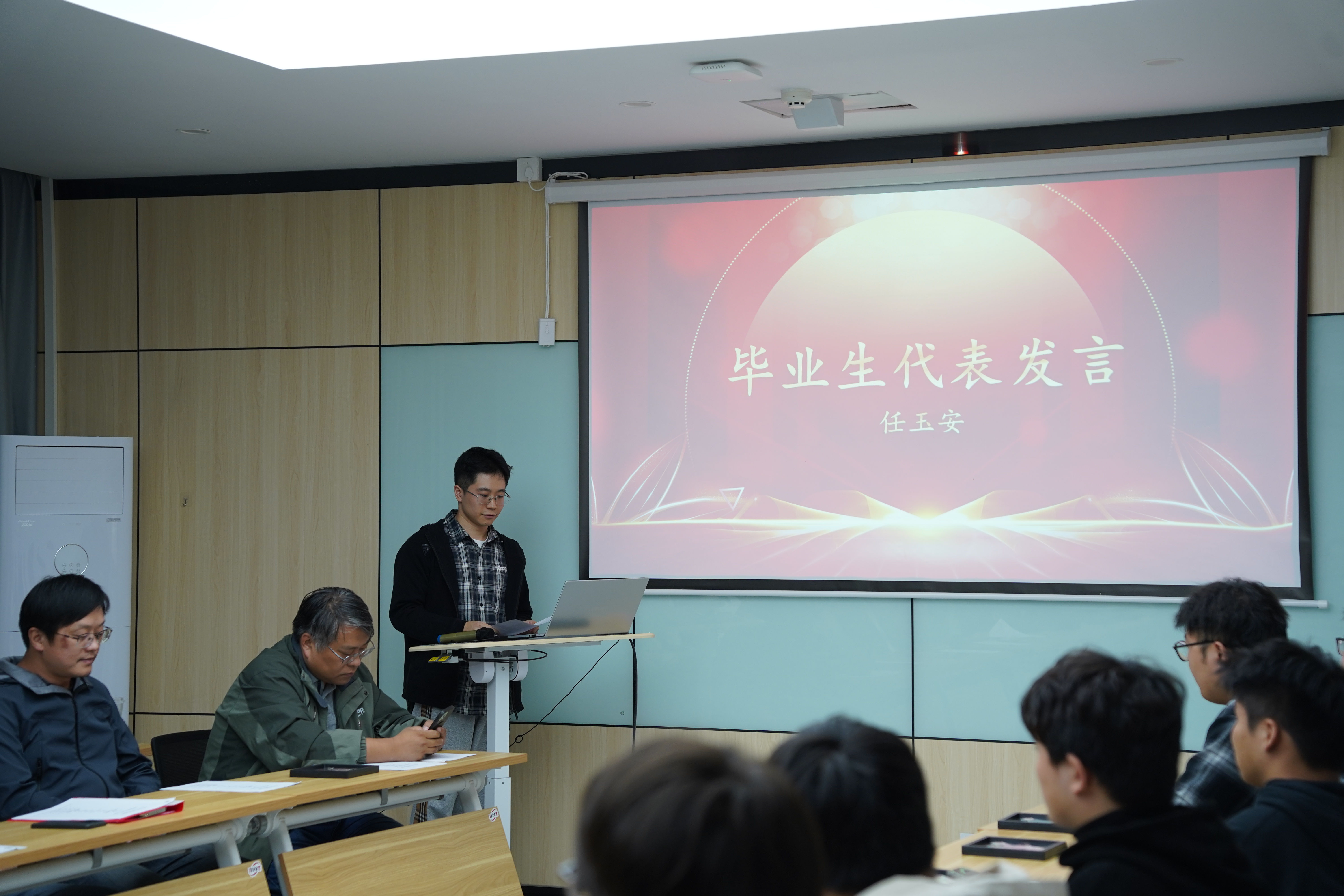 活动特邀嘉宾、硕士毕业生代表任玉安回顾了自己在课题组几年的成长。任玉安师兄首先强调了文献是科研创新的源头活水,广泛阅读文献对于激发创新思维、构建独立研究体系的关键作用;认为与导师、同门的深入讨论以及跨团队的学术碰撞,能够有效优化研究方案,避免闭门造车的局限,是提升研究效率与质量的重要途径。他还强调了研究生学习中广泛阅读文献以激发创新思维、形成独立研究体系的重要性,同时提倡科研过程中的交流合作,以优化研究方法。