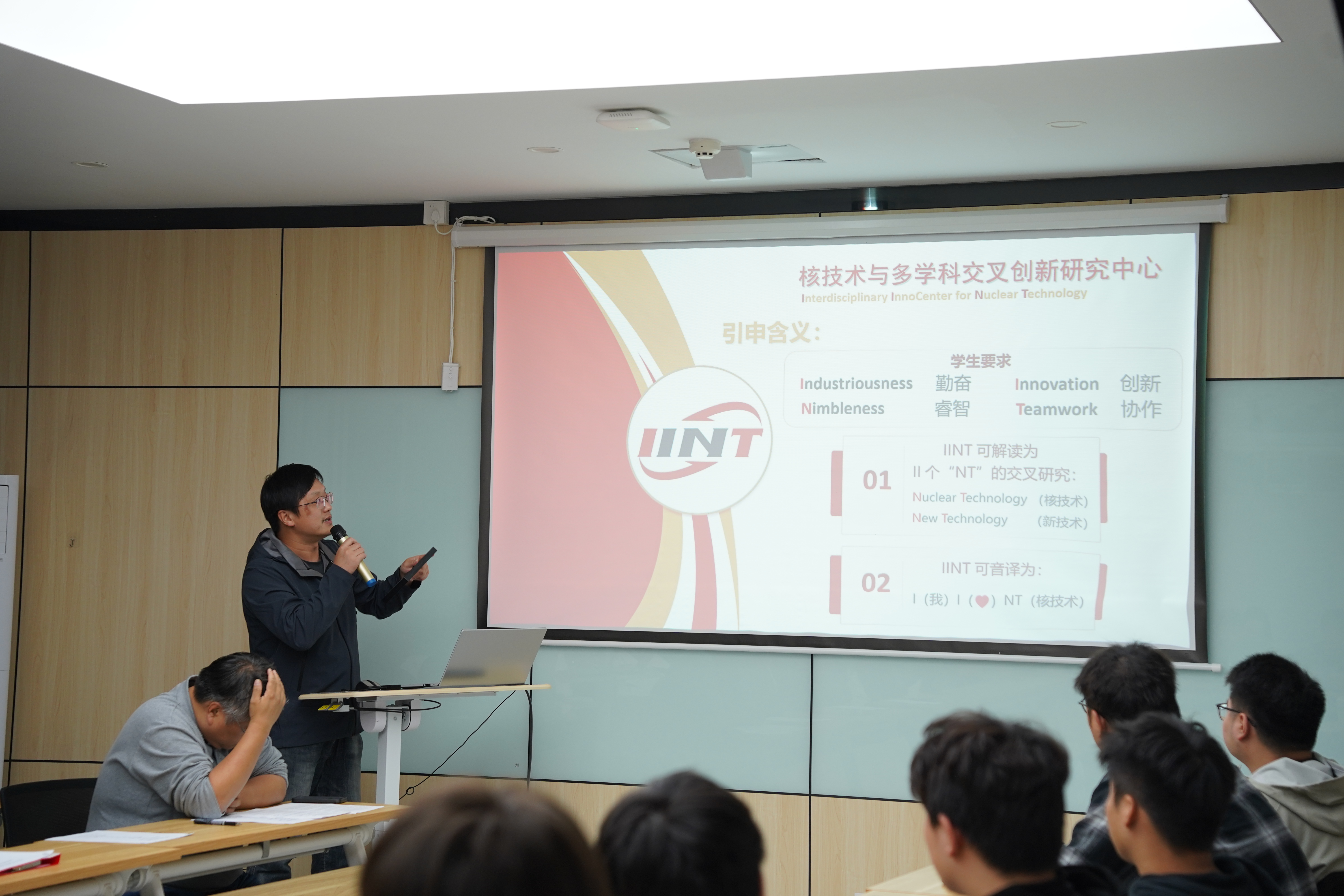 核科学与技术系副主任龚频副教授为全体新生解读了系徽LOGO、团队LOGO的涵义。他以“一枚徽章的时光密码”为引,带领大家穿越历史长河,探寻核科学与技术系及IINT课题组的精神根脉与文化传承。龚老师最后总结道,“这些徽章与标识不仅是视觉符号,更是精神的容器——它们承载着前辈的嘱托、团队的智慧,更寄托着对新一代科研学子的期待。希望同学们读懂它们的深意,在未来的科研路上,让这份精神血脉转化为攻克难题的力量,让IINT的标识因你们的突破而更加闪耀。”龚老师的解读,既是一次生动的文化课,更是一堂深刻的“科研第一课”。