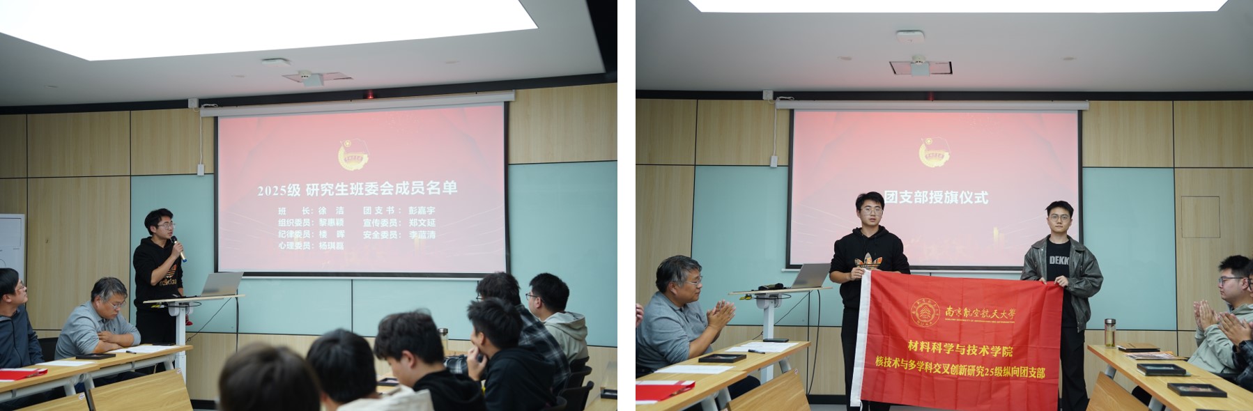 随后,核科学与技术系教工支部副书记陈飞达副教授宣读了核技术与多学科交叉创新研究25级纵向团支部的成立文件。24级核心团支部书记刘尧扬公布了2025级研究生干部名单,并向25级核心团支部书记彭嘉宇授予团支部旗帜。