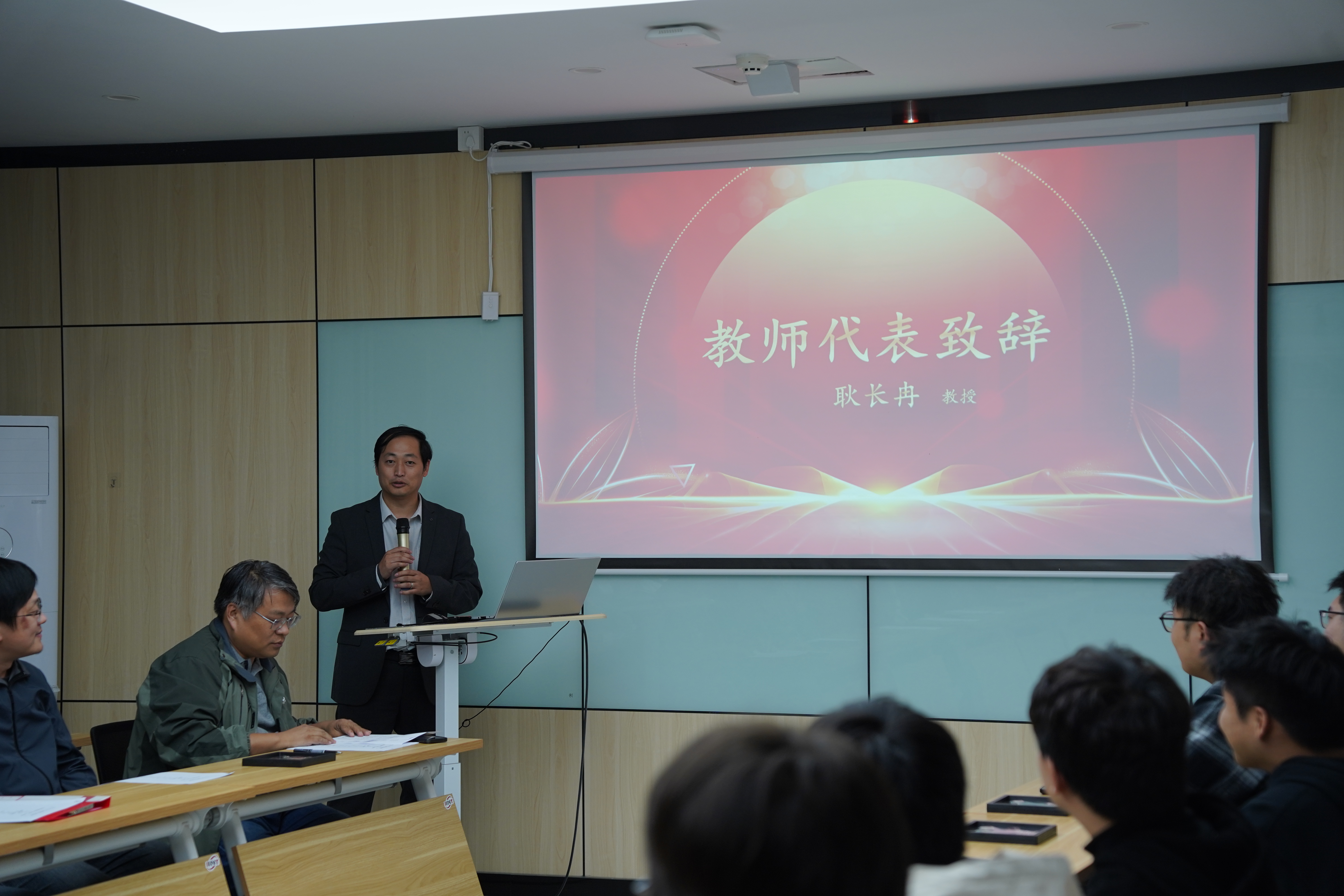 教师代表耿长冉教授在致辞中,结合自己的求学经历,分享了多位科学家的感人事迹,勉励新生,要主动跳出“求稳怕难”的思维定式,以“探索未知”的勇气投身有意义、有价值的研究,在解决真问题中实现学术理想。围绕研究生阶段的核心能力培养,耿教授特别强调了“批判性思维”的重要性。“科研的本质是质疑与创新,唯有保持独立思考的能力,才能在文献海洋中辨明方向,在实验数据里发现突破。”他鼓励新生既要尊重学术传统,更要敢于挑战权威,在“破”与“立”的辩证中锤炼学术本领。