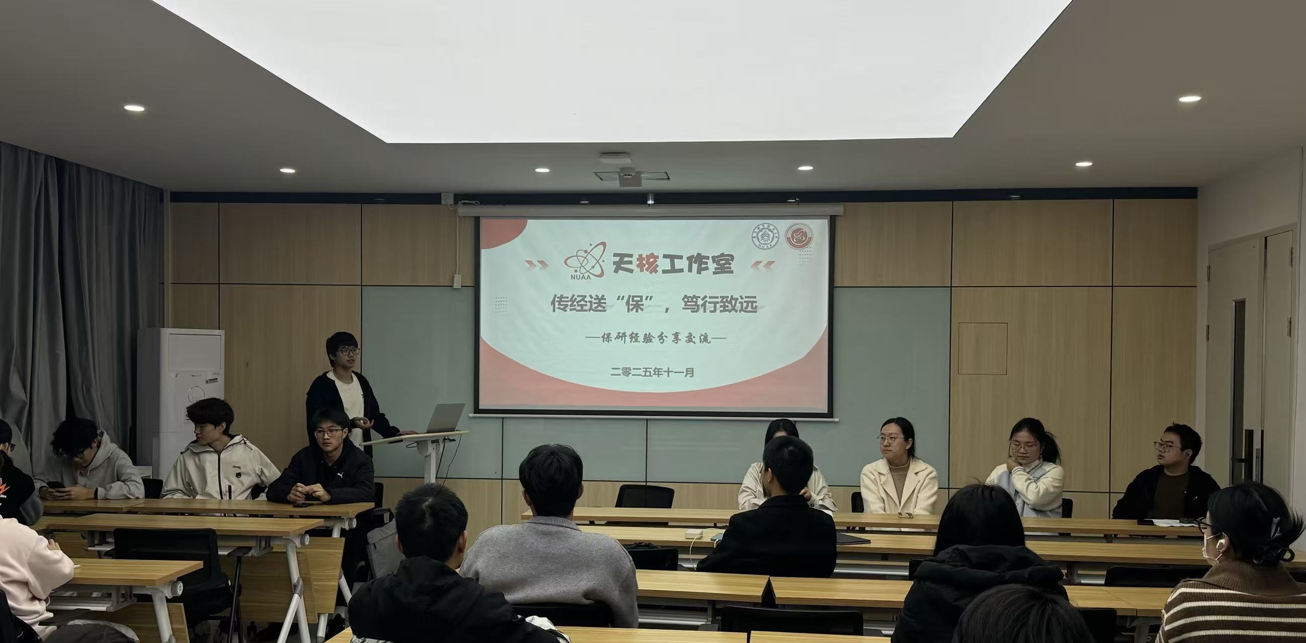 2025年11月15日,天核工作室在核化楼201会议室举办“传经送‘保’,笃行致远”保研经验分享交流活动。八位获得今年保研资格的天核工作室大四年级成员李文汇、廖华亮、韩璐、张楠、黄亮亮、马哲、郭宝溢、尹佳坡担任分享嘉宾,为大二、大三年级成员分享保研经验。