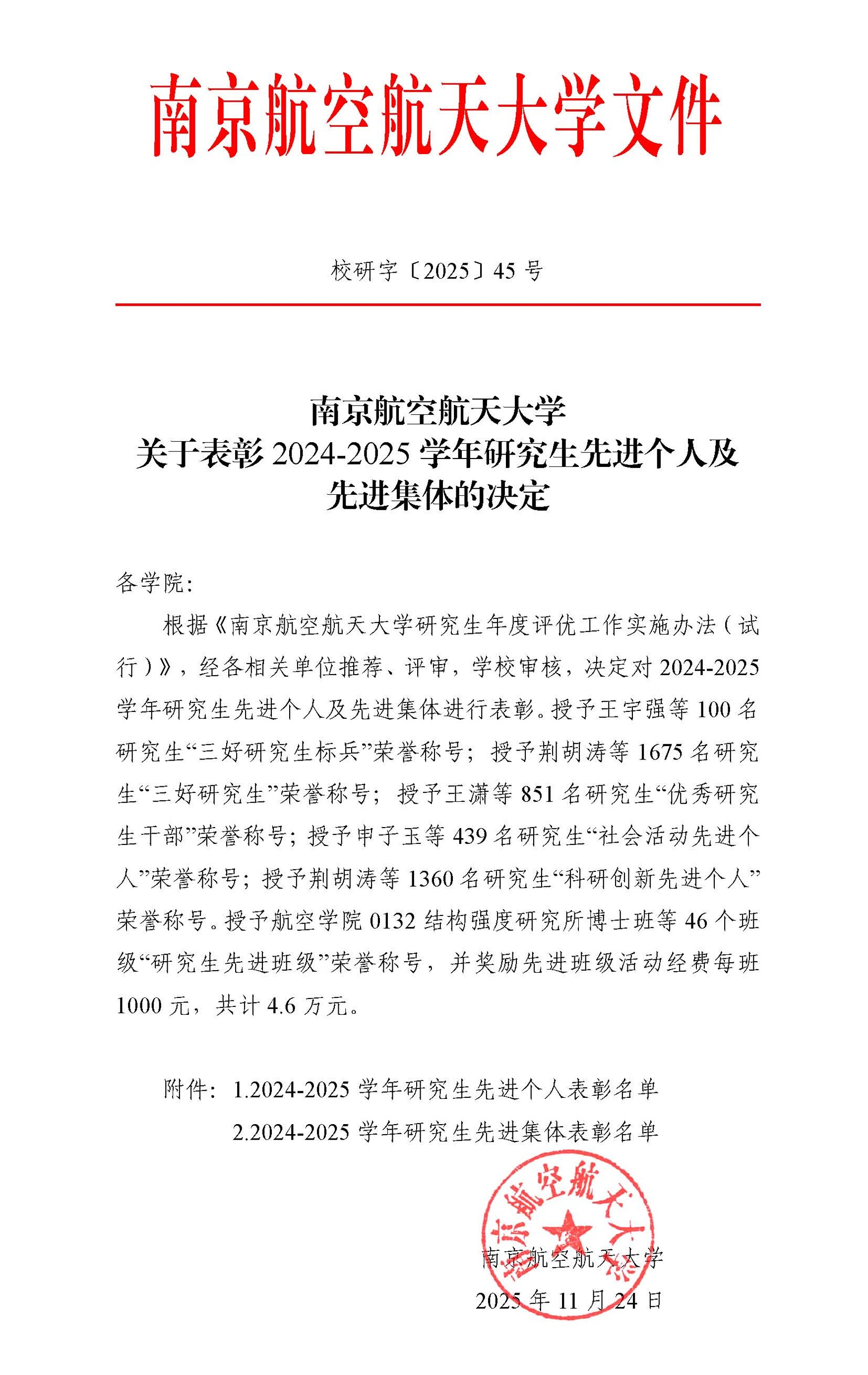 2025年11月24日,校研究生院公布了《南京航空航天大学关于表彰2024-2025学年研究生先进个人及先进集体的决定》。IINT课题组多名研究生获得表彰奖励: