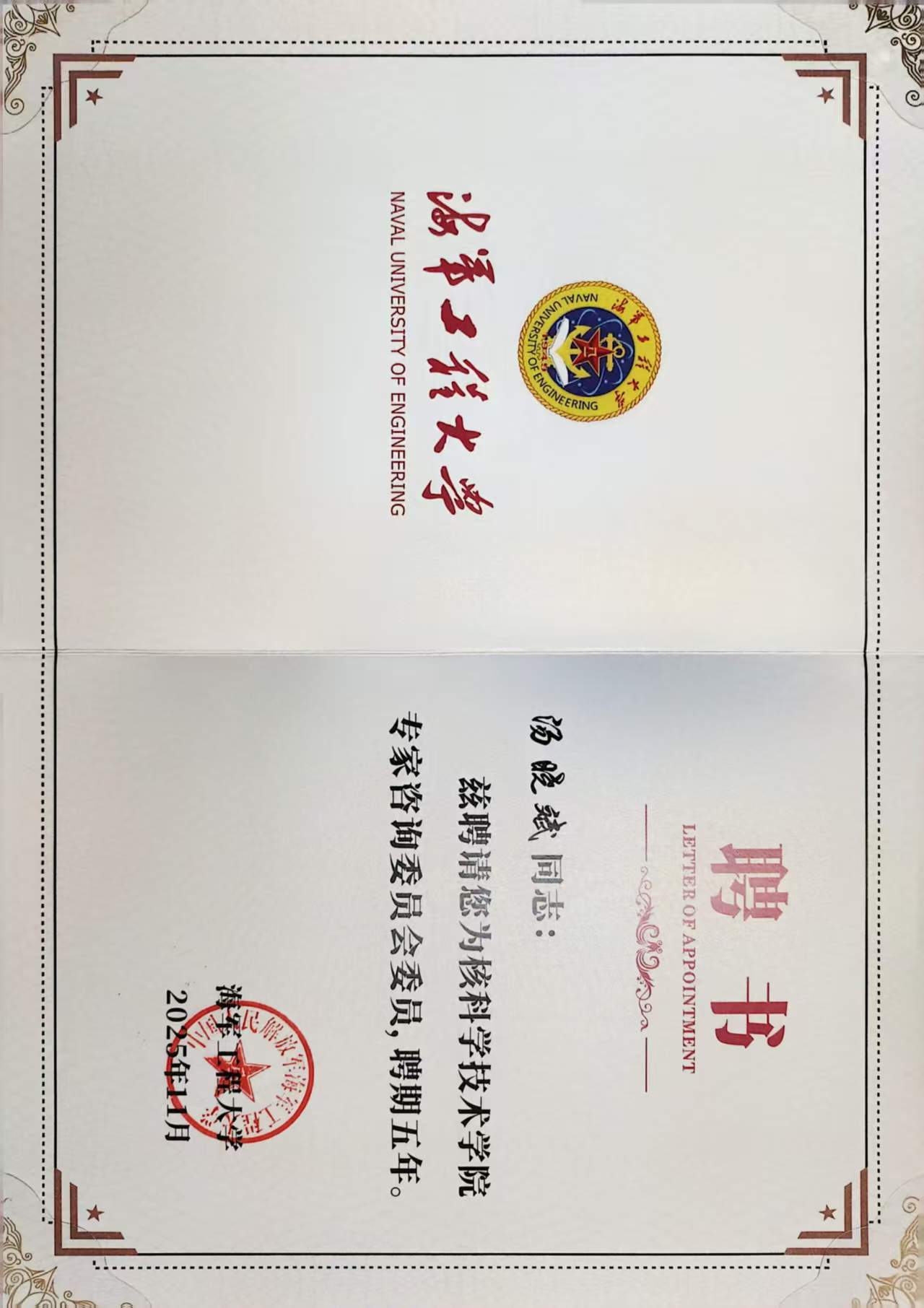 2025年11月21-22日,为探讨核科学技术领域前沿问题和最新研究成果,促进该领域高质量发展,发挥国内知名专家学者在学院战略规划、学科建设、人才培养等方面权威指导与决策支持作用,海军工程大学举办“核聚力量 共创未来”第二届全国高校涉核优秀课程思政案交流会暨某军队重点实验室学术年会,并召开海军工程大学核科学技术学院专家咨询委员会成立大会。IINT课题组汤晓斌教授受聘为海军工程大学核科学与技术学院专家咨询委员会成员,聘期5年。