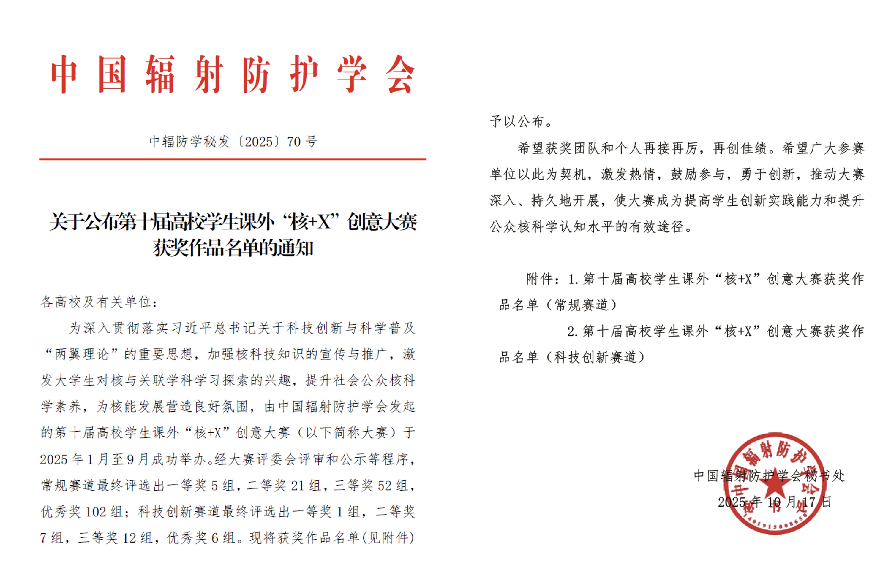 2025年10月17日,中国辐射防护学会正式公布了第十届高校学生课外“核+X”创意大赛获奖作品名单。全国高校学生课外“核+X”创意大赛由中国辐射防护学会、教育部高等学校核工程类教学指导委员会发起,是我国高校核领域规模最大、影响力最广的学科竞赛。本届大赛以“核燃青春强国梦,砥砺十载创未来”为主题,由中国核工业集团有限公司、中国广核集团有限公司主办,苏州大学、科普中国和中国辐射防护研究院承办,于2025年1月至9月成功举办。本届大赛共征集到1402件作品,经大赛评委会评审和公示等程序,常规赛道最终评选出一等奖5组,二等奖21组,三等奖52组,优秀奖102组;科技创新赛道最终评选出一等奖1组,二等奖7组,三等奖12组,优秀奖6组。大赛总决赛暨对话交流活动在我省苏州大学举办。