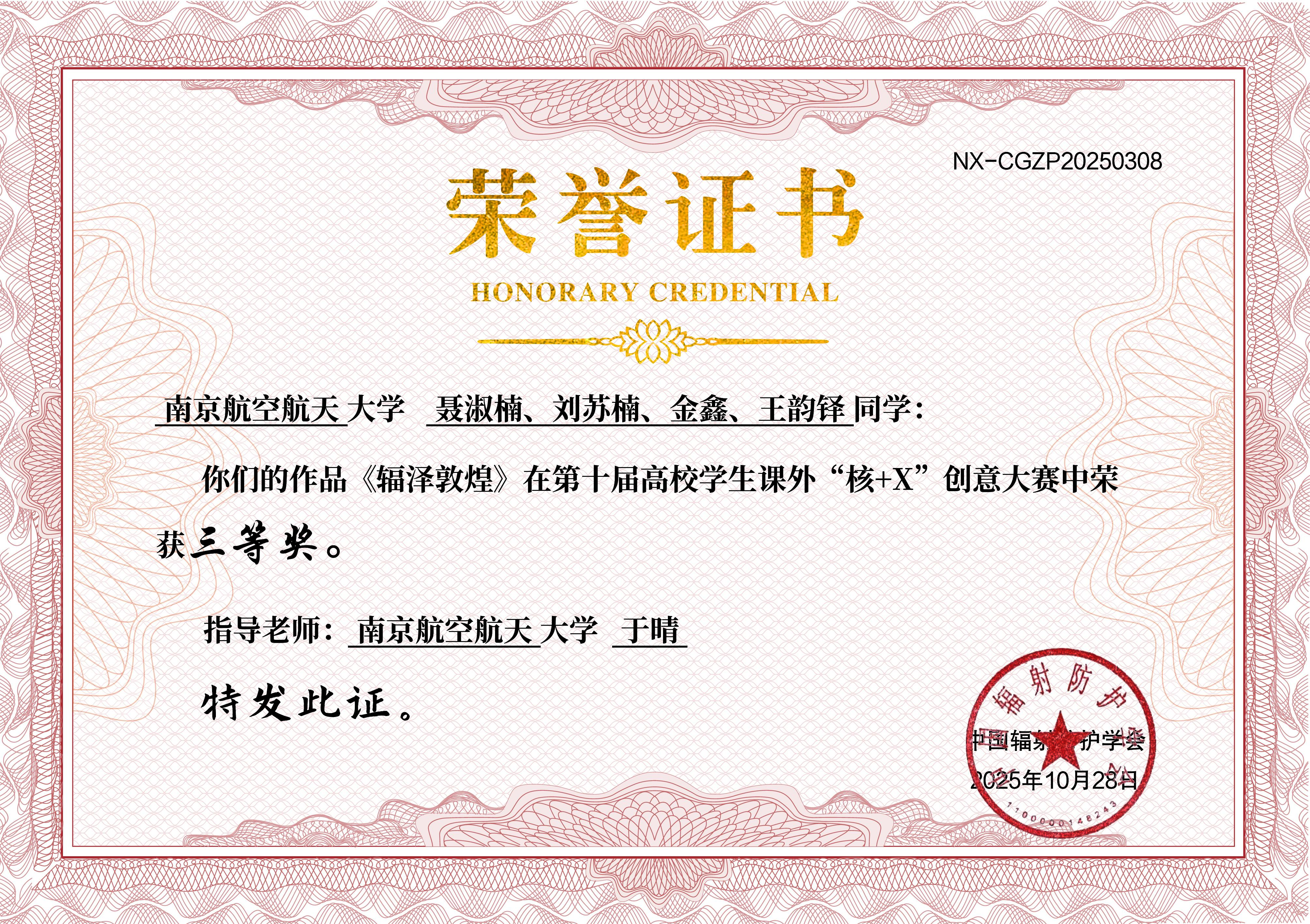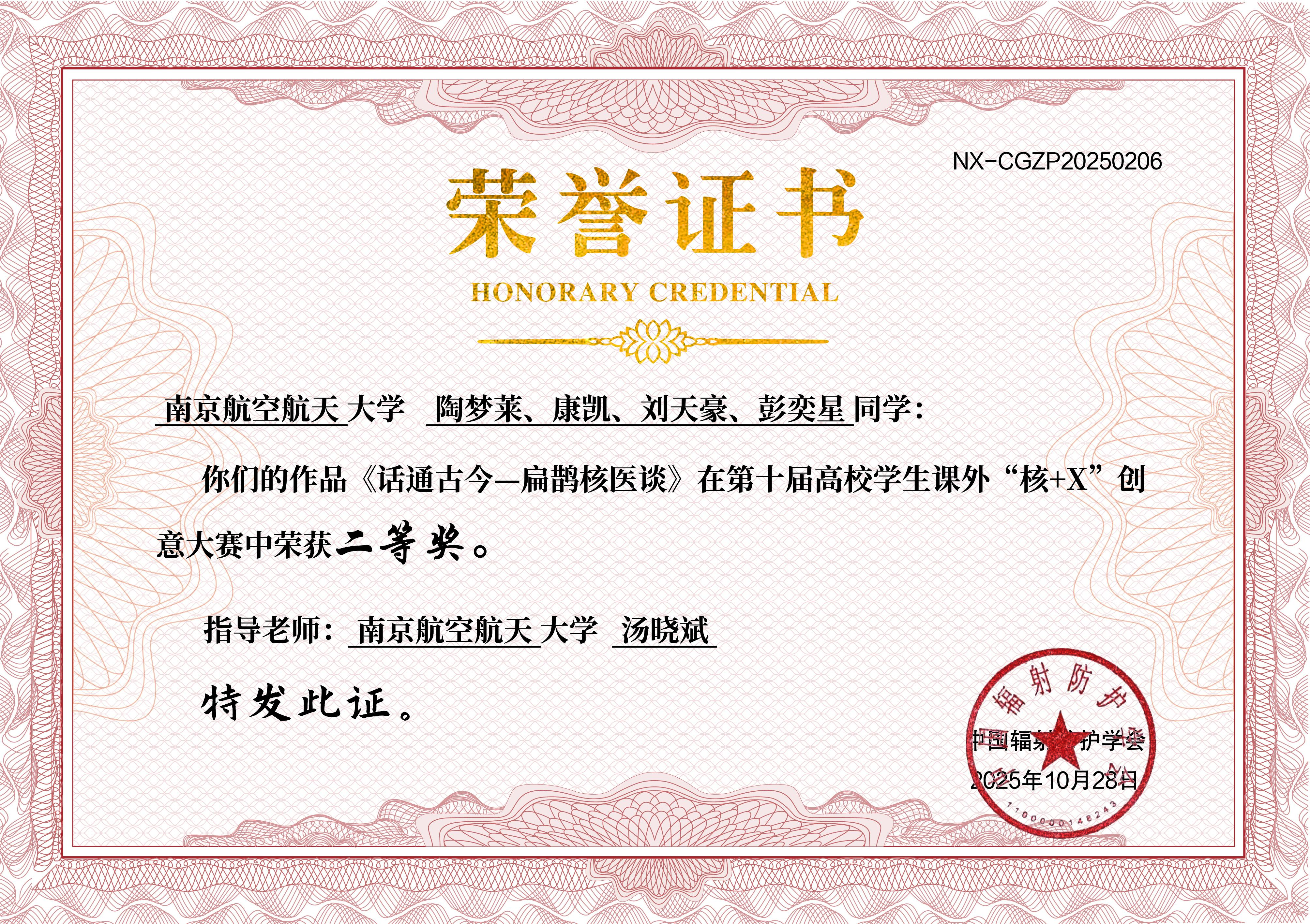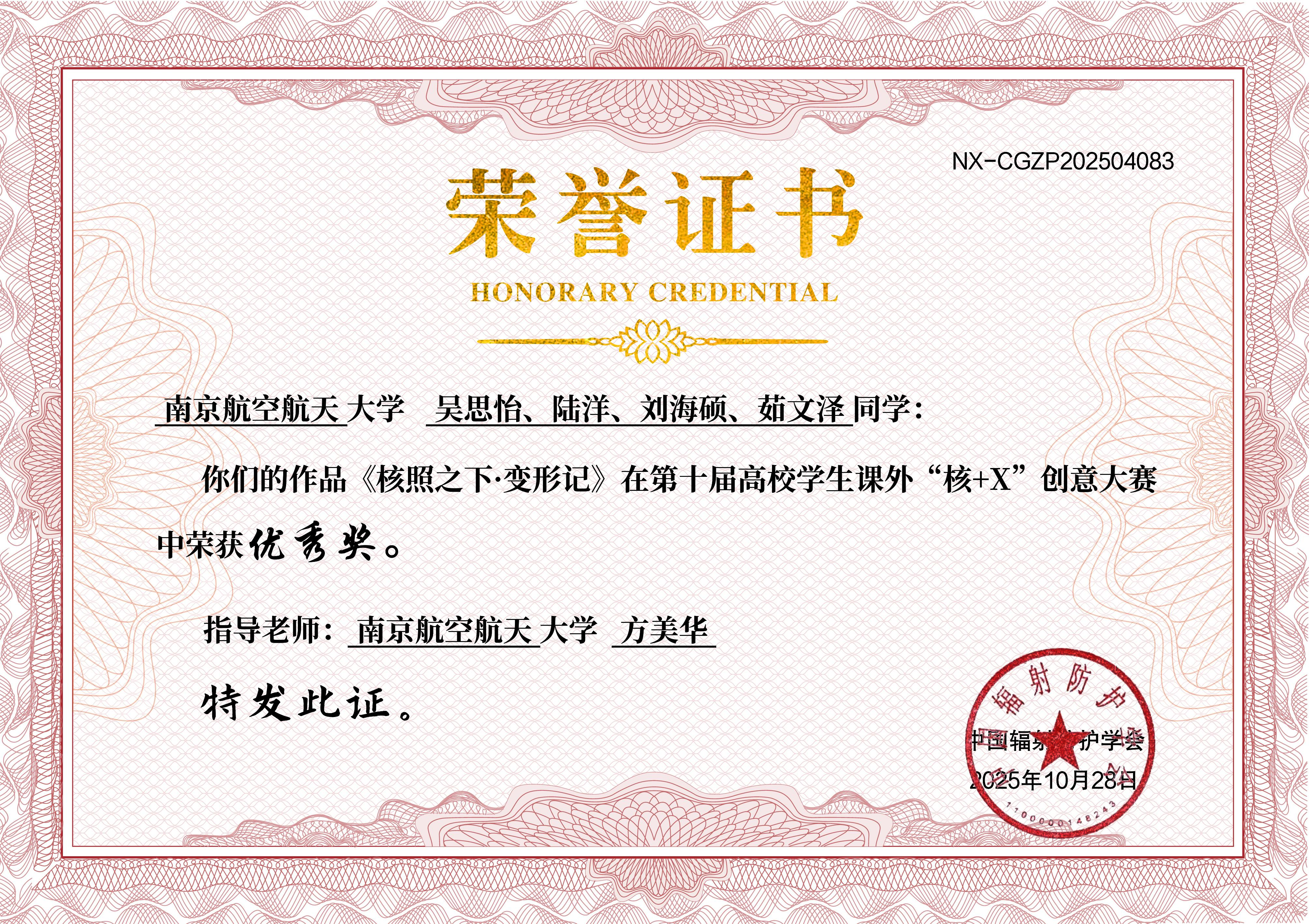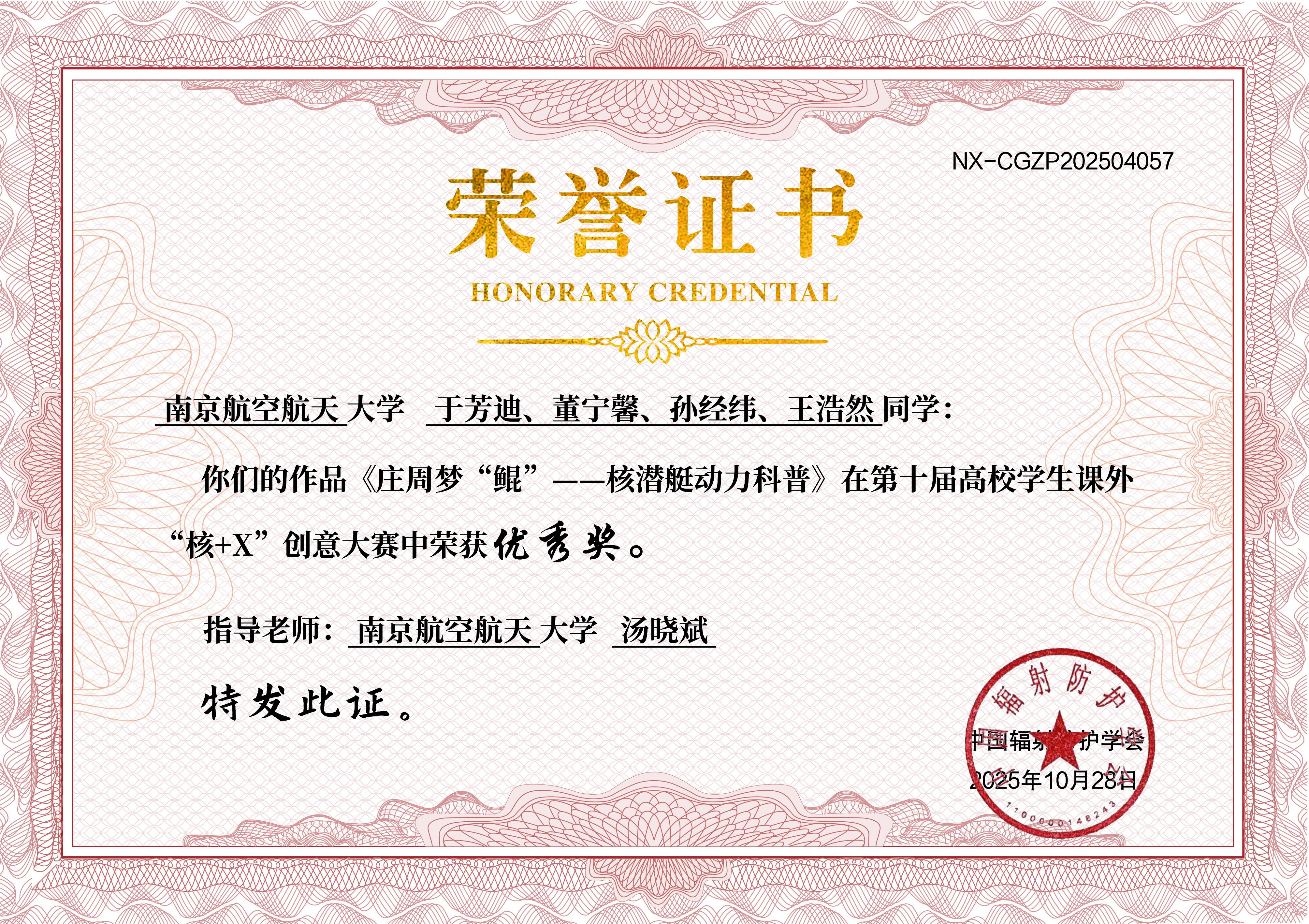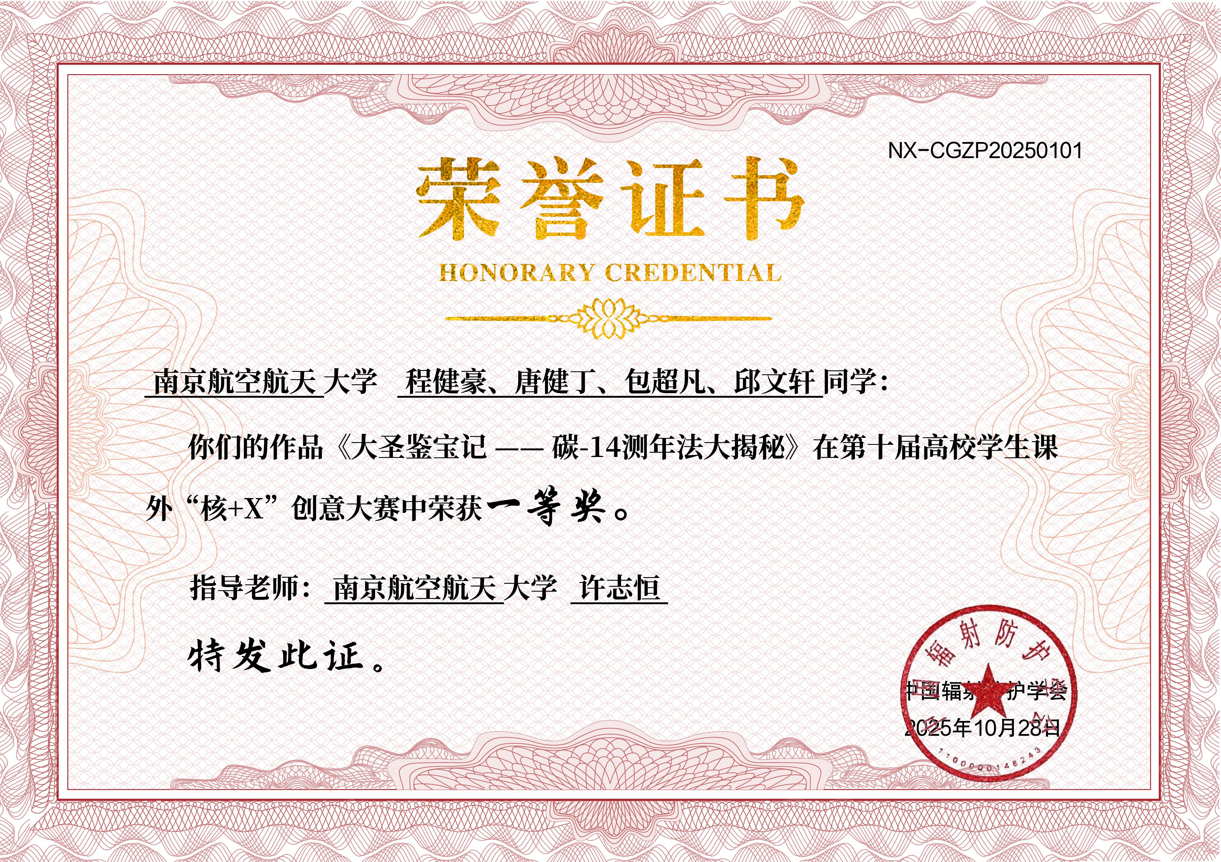 我校在第十届高校学生课外“核+X”创意大赛中共荣获一等奖1项、二等奖1项、三等奖1项、优秀奖2项。其中,由我校2024级核专业本科生程健豪、唐健丁、包超凡、邱文轩共同创作、IINT课题组许志恒副教授指导的科普作品《大圣鉴宝记-碳-14测年法大揭秘》荣获全国总决赛冠军;程健豪荣获“优秀科普宣教员”第一名。