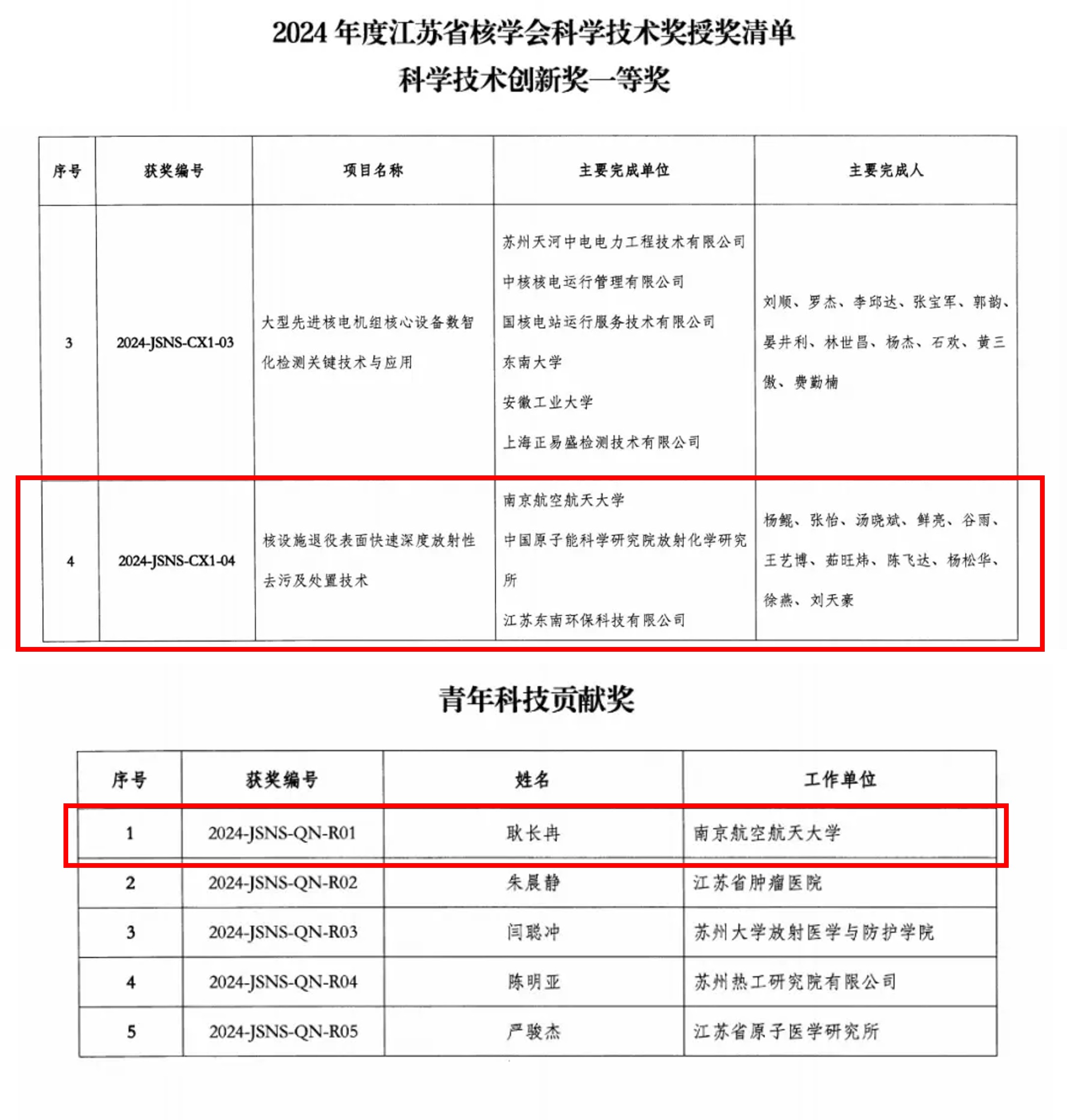 2025年12月8日,江苏省核学会公布了江苏省核学会科学技术创新奖、青年科技贡献奖名单。为表彰核科学技术领域创新成果与杰出青年人才,依据《江苏省核学会科学技术奖奖励办法》,江苏省核学会经评审委员会严格评审、公示无异议,决定授予25个项目江苏省核学会科学技术创新奖(其中一等奖5项、二等奖10项、三等奖10项);授予5人江苏省核学会青年科技贡献奖。
