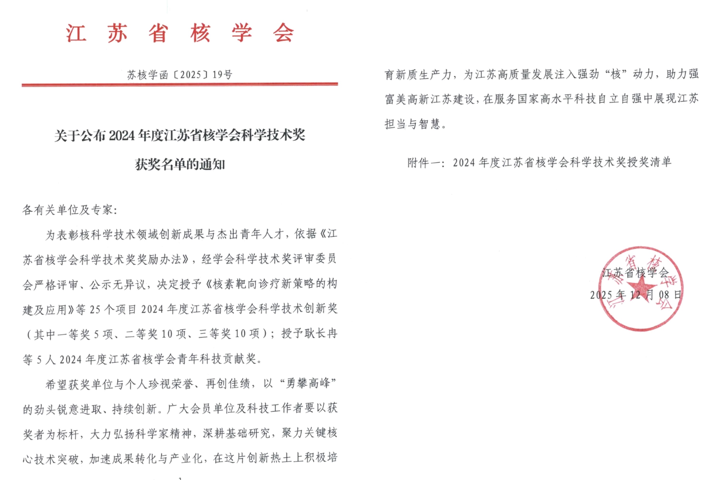 2025年12月8日,江苏省核学会公布了江苏省核学会科学技术创新奖、青年科技贡献奖名单。为表彰核科学技术领域创新成果与杰出青年人才,依据《江苏省核学会科学技术奖奖励办法》,江苏省核学会经评审委员会严格评审、公示无异议,决定授予25个项目江苏省核学会科学技术创新奖(其中一等奖5项、二等奖10项、三等奖10项);授予5人江苏省核学会青年科技贡献奖。