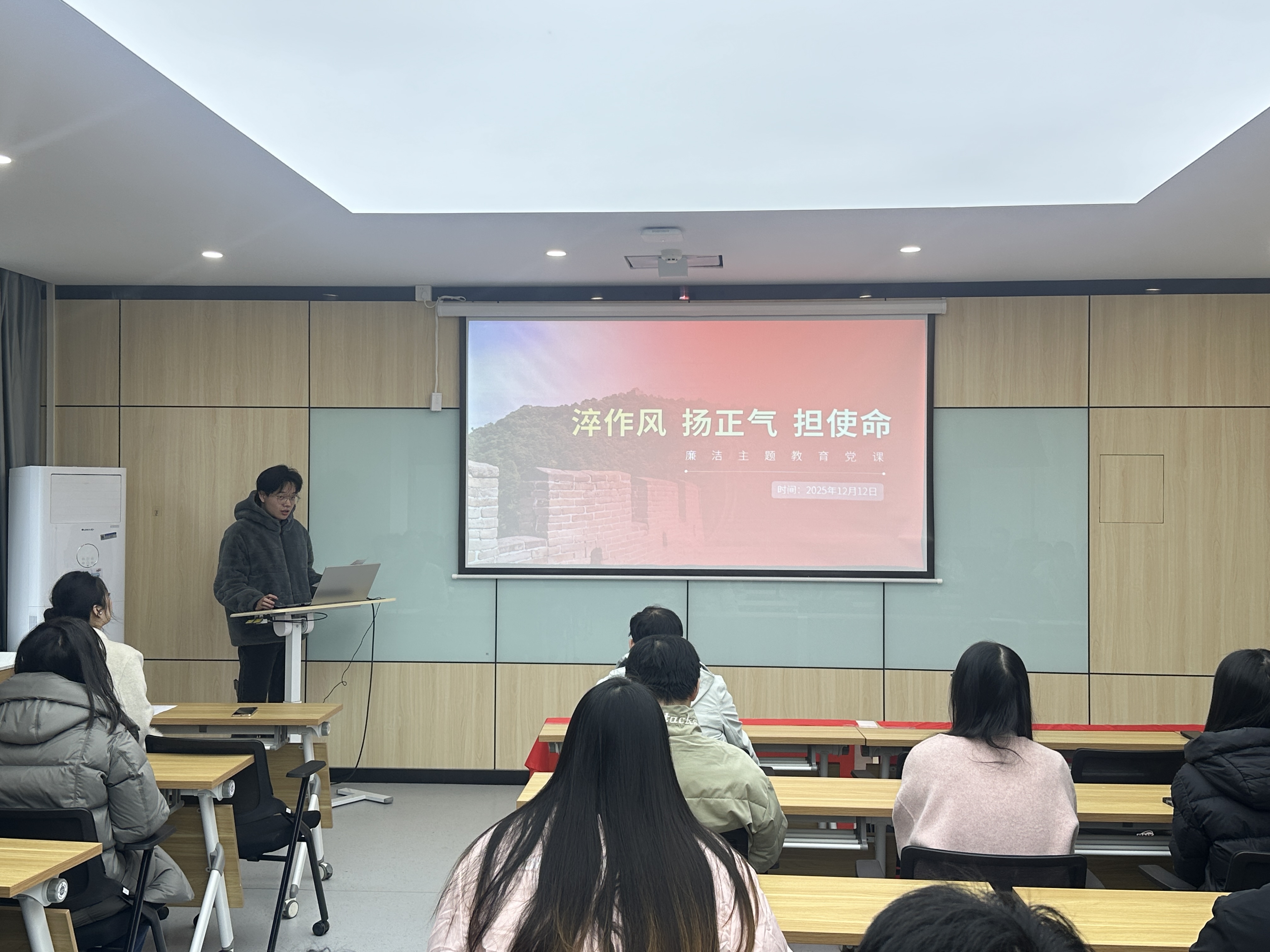 第二项议程为党纪学习教育专题党课。支部纪检委员杨思同志立足全面从严治党时代要求,结合典型案例与制度解读,深入阐述《中国共产党纪律处分条例》核心要义与实践指向。以“淬作风、扬正气、担使命”为命题,以“廉政”核心为主题,开展本次党课。课程强调,全体党员须常怀律己之心、紧绷纪律之弦,将党纪内化为言行准则,筑牢拒腐防变思想防线。与会党员专注聆听、认真记录,一致表示将以更高标准严守纪律规矩,永葆共产党员政治本色。