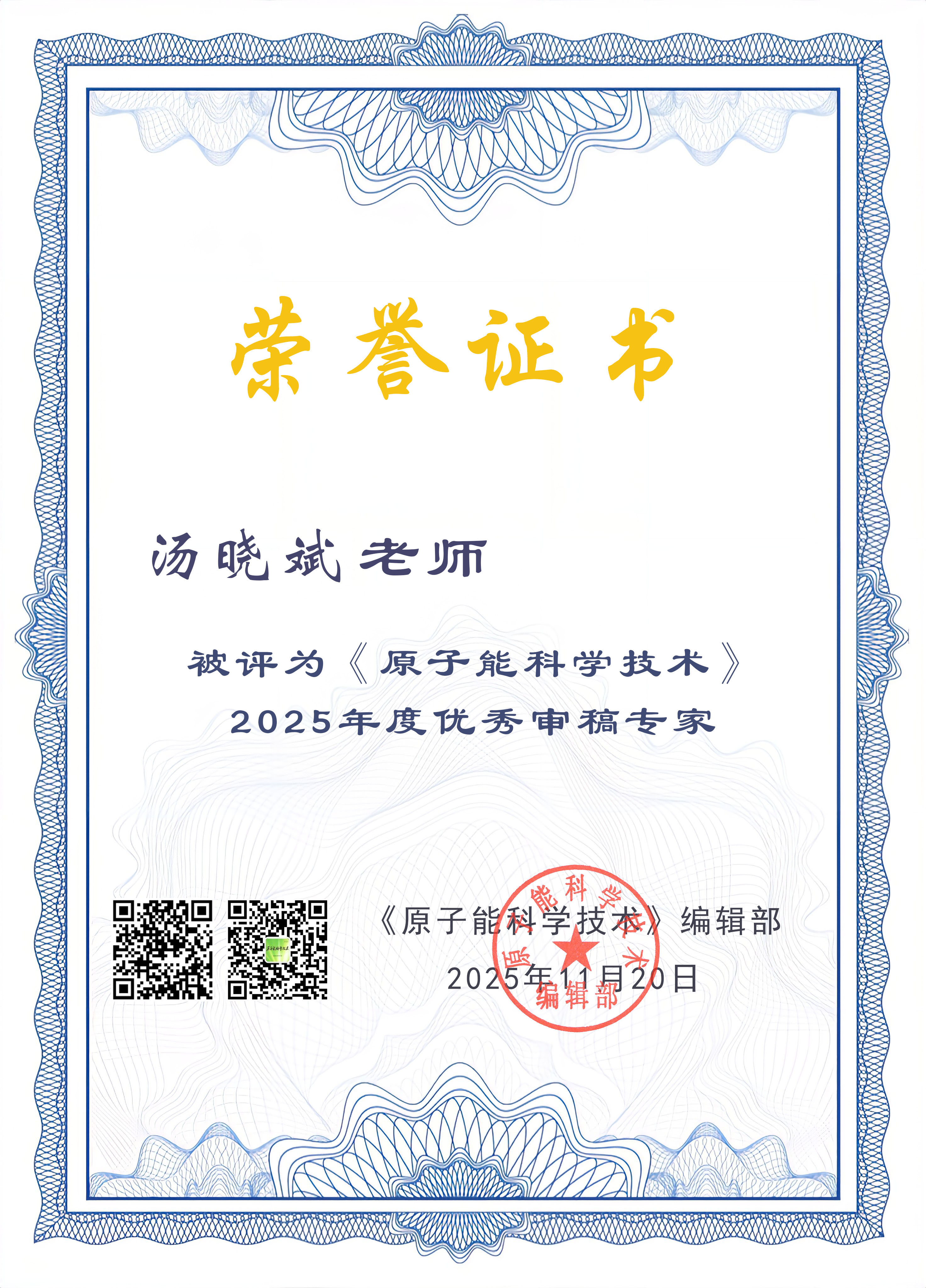 2025年12月26日,由中国原子能科学研究院主办的学术期刊《原子能科学技术》公布了2025年度突出贡献学者、优秀审稿专家名单。IINT课题组汤晓斌教授被评为《原子能科学技术》2025年度优秀审稿专家。据悉,《原子能科学技术》共评选出10位《原子能科学技术》2025年度突出贡献学者、20位《原子能科学技术》2025年度优秀审稿专家。