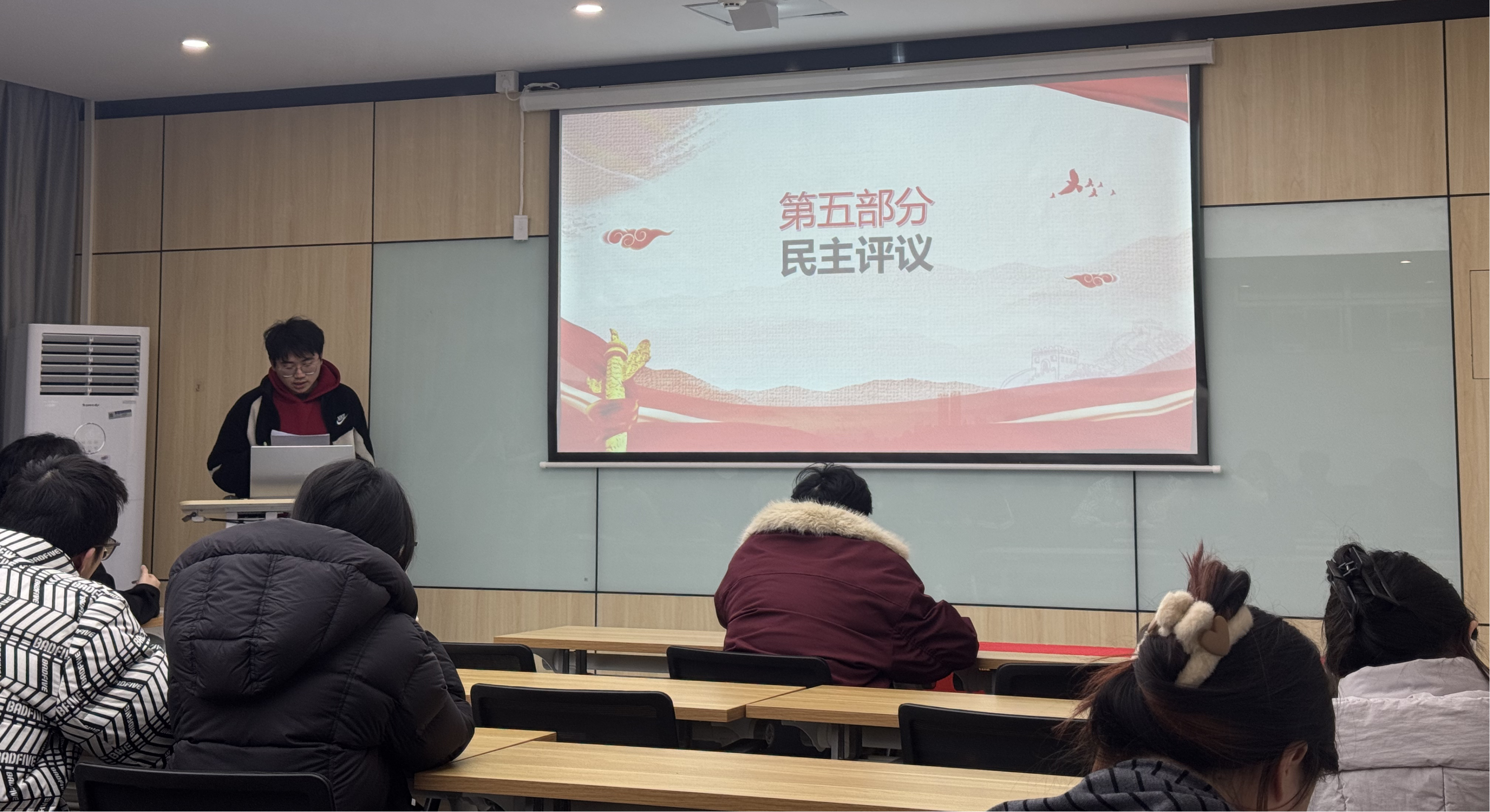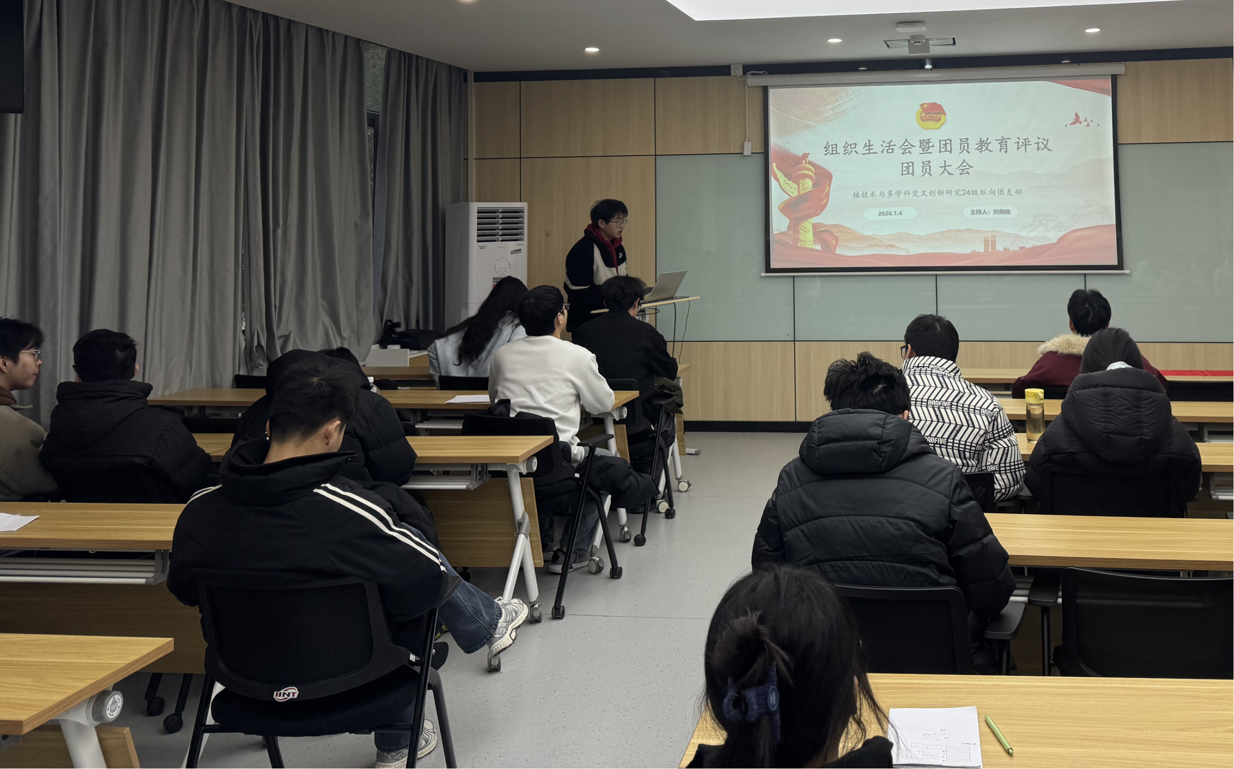2026年1月4日,核技术与多学科交叉创新研究2024级纵向团支部在核化楼201会议室召开2025年度组织生活会暨团员教育评议团员大会。参加本次会议应到团员29人,实到23人。本次大会邀请24级辅导员贺俊健和党支部书记赵浠君做现场指导。会议由团支部书记刘尧扬主持。